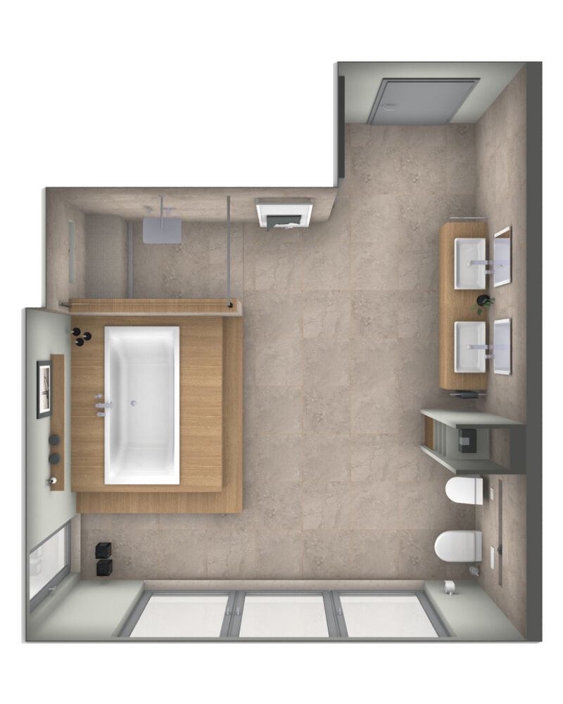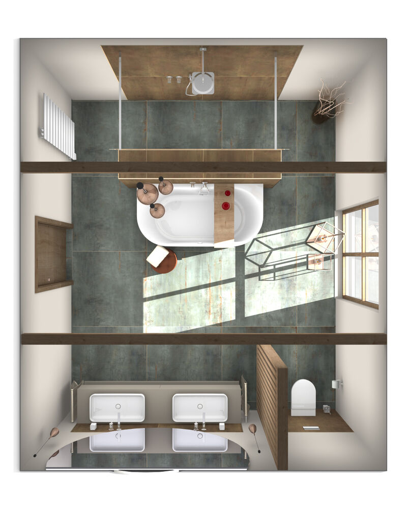 „Mich fasziniert bei der Badgestaltung besonders, welchen Einfluss die Wahl von Farben und Materialien auf die Stimmung hat. Beim Entwurf dieses großflächigen Bades war das neben einer guten Anordnung von Dusche, Wanne, Waschtisch-Ensemble und WC sowie Bidet das Wichtigste. Ich würde den Entwurf als stimmungsvolles und behagliches Refugium für Zwei bezeichnen. Die elegante Anmutung entsteht durch die Kombination aus Roségold, Eiche dekor, Baumwolle und Elfenbein. Das wäre durchaus auch ein Entwurf für mich privat zu Hause.“