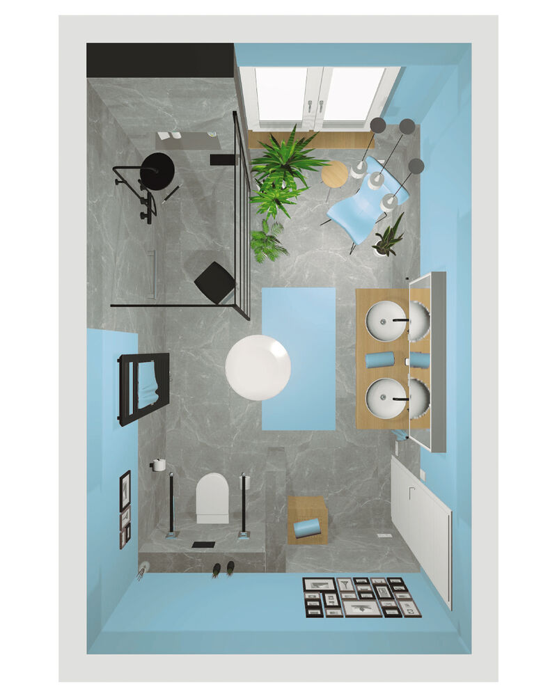 „Mein Badezimmer-Konzept verbindet hochwertige Materialien mit einer warmen, aber mutig-modernen Gestaltung. Zwei elegante Aufsatzschalen ruhen auf einer edlen Massivholzplatte und bilden den Mittelpunkt des Raumes. Die Walk-In-Dusche im schwarzen Industrial Design setzt einen markanten Kontrast und sorgt für eine klare, zeitgemäße Struktur. Hellblaue Wände und Einrichtungsgegenstände erzeugen Behaglichkeit und bringen mutige Farbigkeit ins Konzept, während graue Fliesen für Balance sorgen. Üppige Pflanzen runden den Raum ab. Sie schaffen Natürlichkeit und frische Akzente für eine wohltuende Atmosphäre, die täglich zum Ankommen und Aufatmen einlädt.“