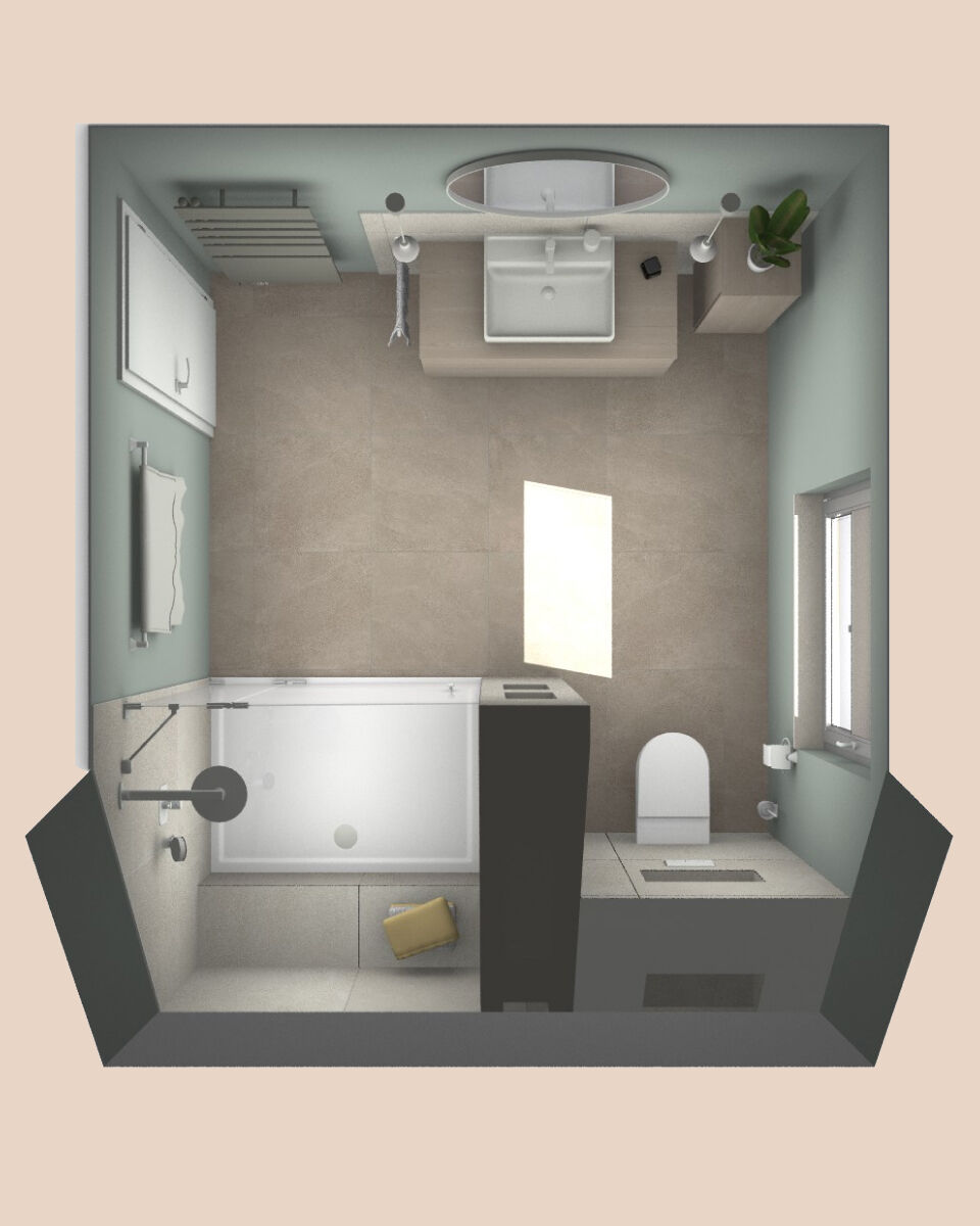 neben WC und Waschplatz auch eine vollwertige Dusche Platz. Das zeigt: Es geht viel, wenn man sich vom Grundriss nicht einschüchtern lässt.“